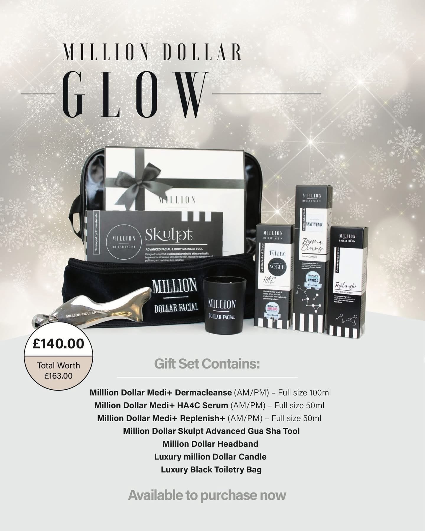 Contains: Milllion Dollar Medi+ Dermaclenase, Medi+ HA4C serum, Medi+ replenish+, Gua Sha tool, headband & candle in a luxury black bag.